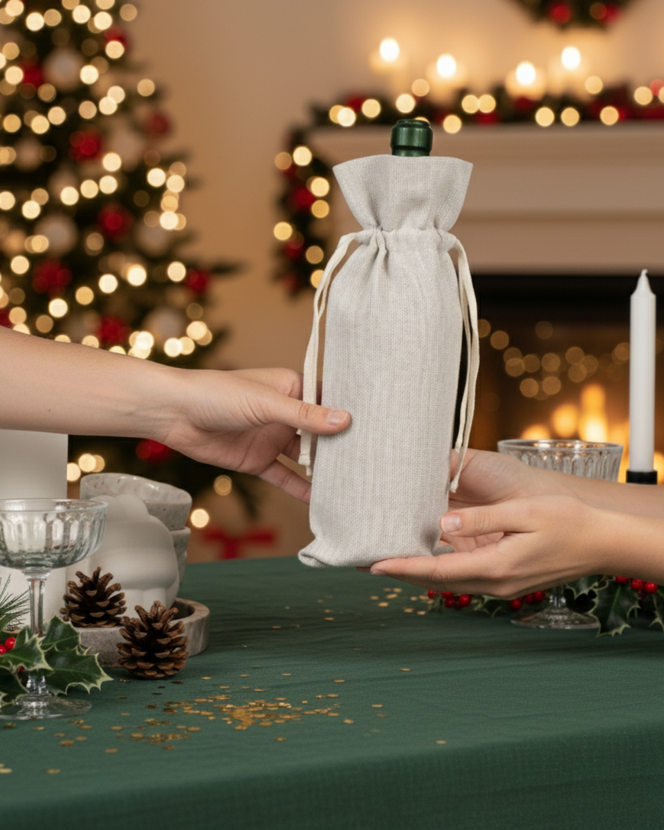 Notre élégant sac cadeau pour bouteille de vin en lin est conçu avec une fermeture pratique par cordon en haut, apportant une touche de charme festif. Disponible dans les couleurs ultimes de Noël - naturel, un rouge pur vibrant, et un vert pierre sophistiqué - ce sac apporte chaleur et style à vos célébrations de fin d'année. Parfait pour offrir en cadeau ou comme accessoire réutilisable pour vos propres réunions, ce sac durable et écologique est aussi attentionné que le vin qu'il contient.