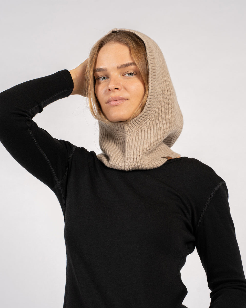 Apparel is knitted from Merino (70%) and cashmere (30%) wool blend. The cashmere gives warmth and softness while the Merino wool provides the body and elasticity that an accessory needs. In addition, cashmere visibly change the texture of the fabric, add some real warmth (literal and figurative) and softness to the fabric. The garment tends to have excellent thermal abilities, is durable and comfortable enough to wear close to the skin.