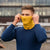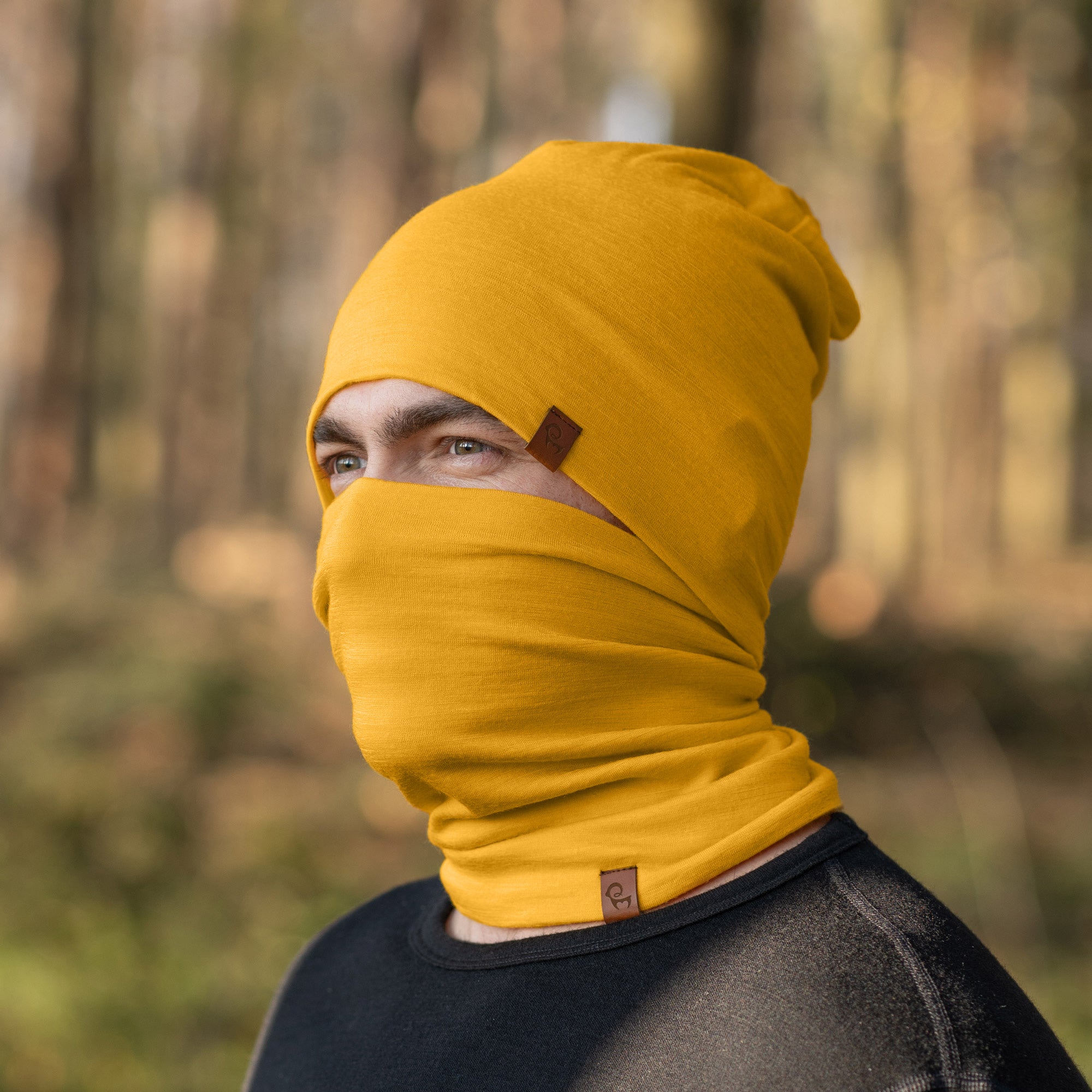 A person with light eyes is wearing a spicy yellow menique beanie that is pulled down to cover part of their forehead and a matching neck gaiter that is pulled up to cover their mouth and nose. They are wearing a dark long-sleeved shirt, and the blurred background suggests an outdoor setting with trees and foliage in muted tones.