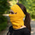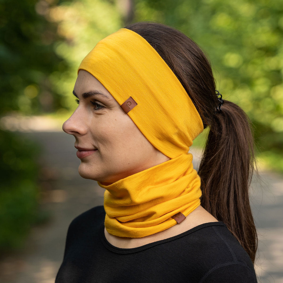 Side view of woman wearing yellow Merino wool headband and gaiter set for outdoor comfort